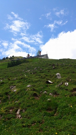 Wir passieren den 1er-Polsterlift und queren einen langen, steilen Grashang, auch die Polster-Rinne genannt. Nach einer weiteren Kehre gelangen wir zum Polster Schutzhaus und zugleich zur Bergstation vom 1er-Sessellift. Kurz darauf erreichen wir den Gipfelgrad und steigen die letzten Höhenmeter zum Gipfelkreuz hoch.