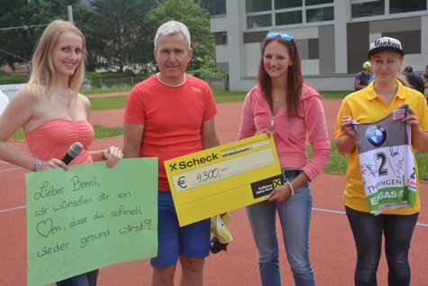 Zur Mittagszeit roch man den köstlichen Geruch von Gegrilltem über dem ganzen Sportplatz, denn natürlich war auch für das leibliche Wohl bestens gesorgt. Abschließend durfte Herr Hinterberger, der Vater von Benni, ein Trikot von Christoph Sumann, eine riesige Karte mit Genesungswünschen von allen Teilnehmern und einen Scheck in einem Wert von € 4.300,- entgegennehmen.