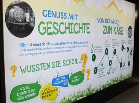 In der OM Milch Erlebniswelt werden Ihnen die vielen Seiten der Milch näher gebracht. Von der Landwirtschaft, über die Sortenvielfalt bis hin zur Verarbeitung und dem Käseguss, wird hier alles genau erklärt.