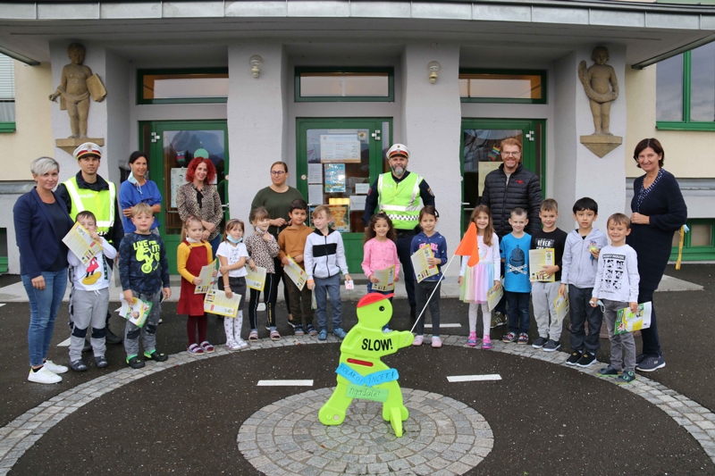 Bürgermeister Harald Bergmann besuchte mit Vertretern der Polizei die ersten Klassen der beiden Knittelfelder Volksschulen, um auf die Gefahren am Schulweg aufmerksam zu machen.