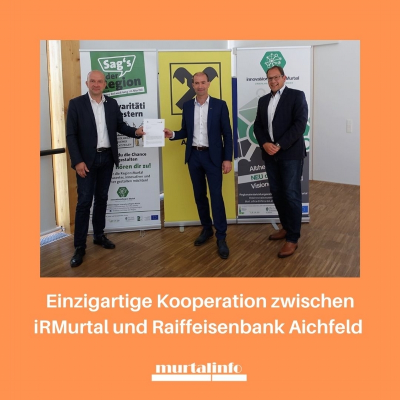 Gemeinsam für die Regionalentwicklung Die LEADER-Region innovationsRegion Murtal (iRMurtal) und die Raiffeisen Bank Aichfeld gehen eine strategische Partnerschaft ein um die Vorfinanzierung von Projekten ohne Zinsen und Gebühren abwickeln zu können.