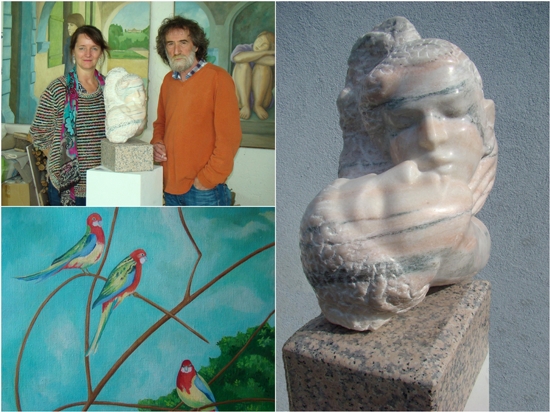 Herzstück der Ausstellung ist das Werk „Kuss“ aus Sölker Marmor. Die weiteren Skulpturen sind, ganz der Tradition der Steinbildhauerei folgend, aus Carrara Marmor und einige Werke aus feinem rotgemaserten Marmor, der aus einem kleinen Steinbruch in der Republik Kosovo, stammt. Die großformatigen Bilder von Barbara Gashi sorgen für ein fröhliches Ambiente. Bunte Vögel und Fische, eine ins Wasser ...