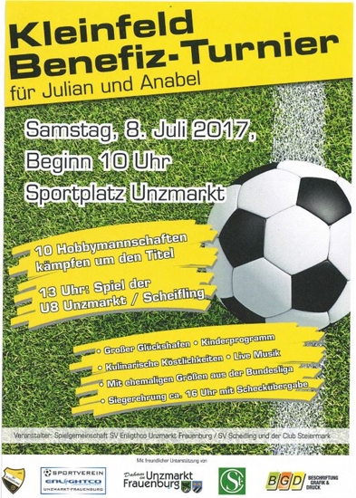Am Samstag, dem 08. Juli 2017 findet ab 10:00 Uhr am Sportplatz in Unzmarkt-Frauenburg ein Kleinfeld Benefiz-Turnier für zwei schwer erkrankte Kinder, Julian und Anabel, statt. Als Veranstalter agieren die Spielgemeinschaft Enligthco Unzmarkt-Frauenburg der Sportverein Scheifling und der Club Steiermark. Der 6 jährige Julian ist an spastischer Tetraplegie erkrankt, einem Geburtsschaden der eine ...