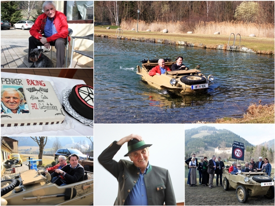 Überraschen konnten den Jubilar am Samstag, zu seinem "runden" Geburtstag viele Freunde in der Gaal. Walter Penker staunte kräftig, als in Wolfgang Habenberger mit seinem Oldtimer, einem VW Schwimmauto, beim Käfermuseum abholte und mit ihm dann direkt durch den Teich vor dem Gaalerhof landete, wo Freunde eine Überraschungsgeburtstagsfeier für ihn vorbereiteten hatten. So viel Wasser hatte er ...