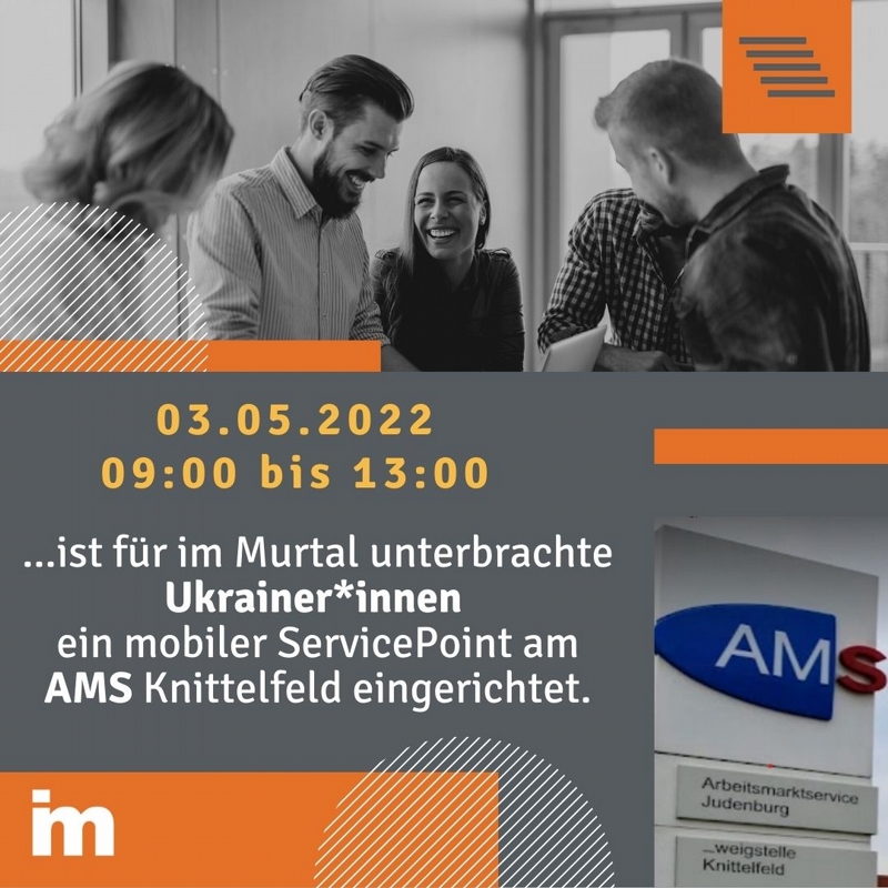 Viele Flüchtlinge aus der Ukraine sind auf Arbeitssuche. Die Eingliederung läuft im Murtal bereits auf Hochtouren. Am 03.05.2022 ist in der Zeit von 09:00 bis 13:00 Uhr für im Murtal unterbrachte Ukrainer_innen ein mobiler ServicePoint am AMS Knittelfeld eingerichtet.