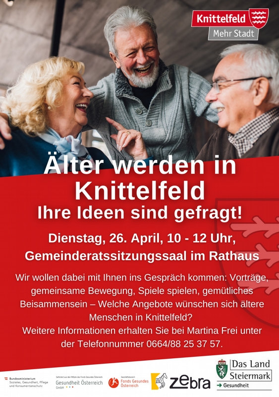 Am Dienstag, 26. April, findet von 10 bis 12 Uhr der Aktionsvormittag „Älter werden in Knittelfeld – Ihre Ideen sind gefragt“ im Gemeinderatssitzungssaal im Knittelfelder Rathaus statt. Hier wird das Projekt „Altern in Vielfalt“ genauer vorgestellt. Im Gespräch mit Knittelfelder Bürgerinnen und Bürgern sollen bei Kaffee und Kuchen zukünftige Aktivitäten geplant werden. Dabei stehen Vorträge, gemeinsame Bewegungsaktivitäten und gemütliches Beisammensein im Vordergrund.