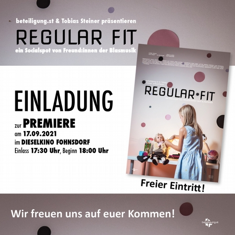 Angefangen von der Ideenfindung, über die gemeinsame Entwicklung eines Drehbuchs bis hin zum Dreh: alle Aufgaben wurden von den Jugendlichen eigenständig durchgeführt. Dabei wurden sie professionell unterstützt. Die künstlerische Leitung übernahm der in Knittelfeld aufgewachsene Tobias Steiner. Von beteiligung.st organisiert, vom Land Steiermark gefördert, bot sich Knittelfeld als Gastgeberstadt an. Das Engagement und der Ideenreichtum der Jugend, die Ausdauer der Schauspieler:innen und die Expertise der Workshopleitung werden im dabei entstandenen Social-Spot mit dem Titel „Regular Fit“ widergespiegelt. Dieser wird am 17. September im Dieselkino Fohnsdorf präsentiert. Um auch einen Einblick hinter die Kulissen zu bekommen, wird ebenso ein Making Of gezeigt. Die Vorführung richtet sich an alle Interessierten und ist kostenfrei.